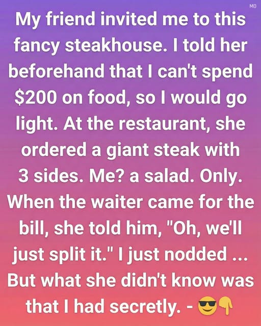 She looked surprised. Not angry—just caught off guard. I handed over my card and paid my portion with confidence. There was no scene, no confrontation. Just clarity. On the way out, I gently reminded her that I had shared my budget beforehand. I wasn’t upset, but I wanted my boundaries respected. That night wasn’t really about steak or salad. It was about understanding that friendship should never come with financial pressure. Real friends don’t assume—they listen. And sometimes, the strongest thing you can do isn’t to argue. It’s to prepare quietly and stand firm with grace.