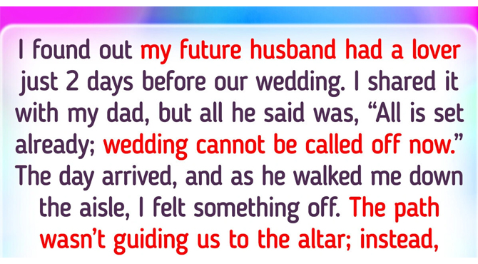 I found out my future husband had a lover just 2 days before our wedding. I shared it with my dad, but all he said was, “All is set already; wedding cannot be called off now.” The day arrived, and as he walked me down the aisle, I felt something off. The path wasn’t guiding us to the altar; instead, it veered off to a side door, away from the waiting guests.Confused, I looked at him, and he winked. “Dad, what’s going on?” I asked. He said, “You don’t have to go through with this. I’ve spoken to the guests and told them the wedding is postponed due to a personal matter. They’ll understand.