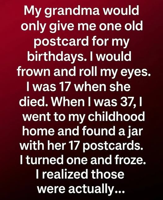 When I was younger, I never understood my grandmother’s way of loving me. Every birthday, while my friends unwrapped boxes filled with gadgets, clothes, or cash, I would receive the same thing: a single, faded postcard. No explanation, no envelope filled with money—just a small rectangle of paper with a picture on one side and a few handwritten lines on the other. I remember forcing a polite smile while disappointment settled quietly inside me. To a teenager, it felt like she wasn’t trying hard enough, like I didn’t matter as much as everyone else. I never said it out loud, but I carried that feeling with me year after year.