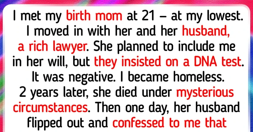 • I met my birth mom at 21 at my lowest. I moved in with her and her husband, a rich lawyer. She planned to include me in her will, but they insisted on a DNA test. It was negative. I became homeless. 2 years later, she died under mysterious circumstances.