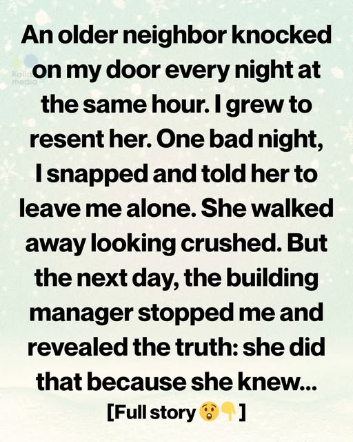 Every single night, without fail, at exactly 9:15 p.m., there would be a knock on my door Three sharp taps. Pause. Two more. When I opened it the first time, an older woman stood there, hunched slightly, gray hair pulled back into a tight bun. Her eyes were sharp, restless.