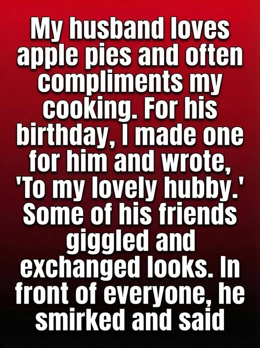 Lena had always known that food was her love language. Her husband, Aaron, adored apple pies, and every time she baked one, his eyes lit up like a child’s on a holiday morning. He never failed to praise her cooking, telling everyone how lucky he was to have a wife who filled their home with warmth and sweet aromas. So when his birthday approached, Lena decided to make the day extra special. She spent hours perfecting the pie, brushing the crust until it shone golden, and writing a small message on top: “To my lovely hubby.” It was simple, heartfelt, and meant only for him.