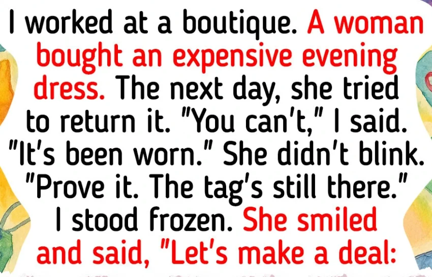 She didn’t blink. “Prove it. The tag’s still there.” I stood frozen. She smiled and said, “Let’s make a deal: you take back the dress, and I won’t write a bad review about you, no one will know about your mistake.”